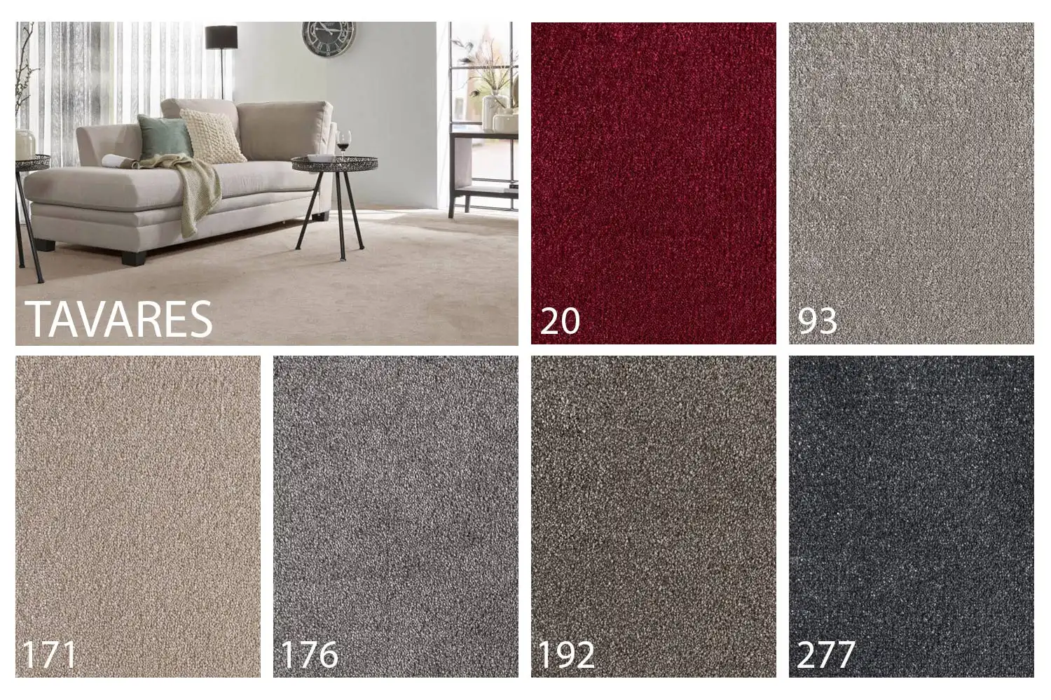 Koberec Tavares je vyrobený z polypropylénových vlákien v rôznych matných farebných odtieňoch s melírom, ktoré sú známe svojou odolnosťou a jednoduchou údržbou. Koberec má podklad typu ActionBack (tkaná syntetická juta), ktorý ešte zvyšuje jeho odolnosť a pevnosť. Koberec je vhodný do náročnejších interiérových priestorov akým je hala, obývačka a svoje uplatnenie nájde aj v hoteloch alebo v kanceláriách.