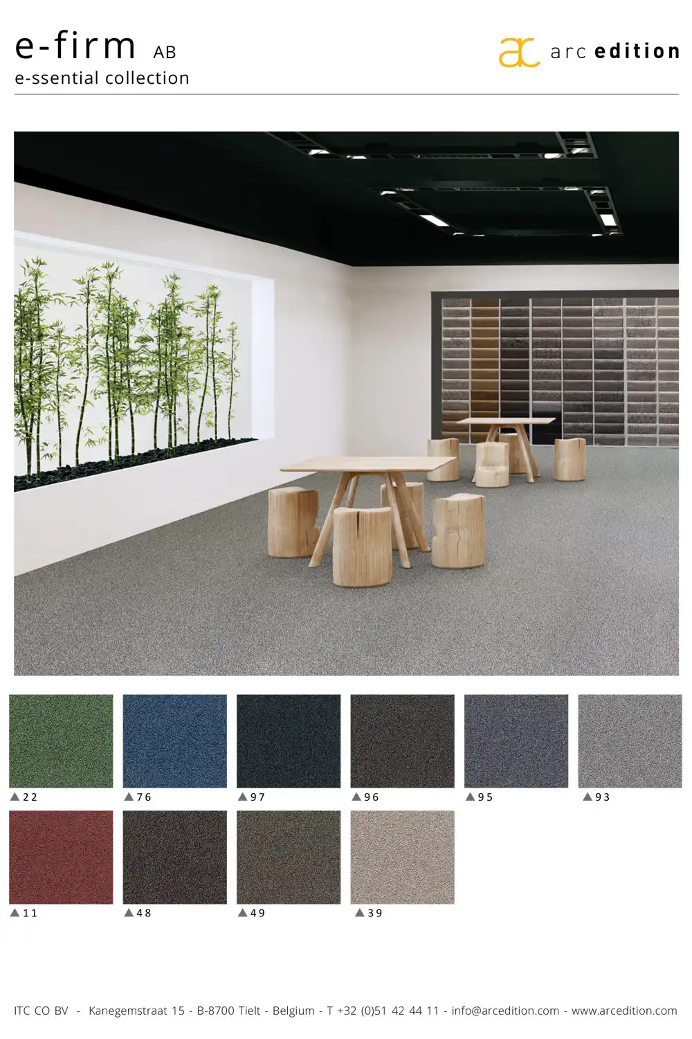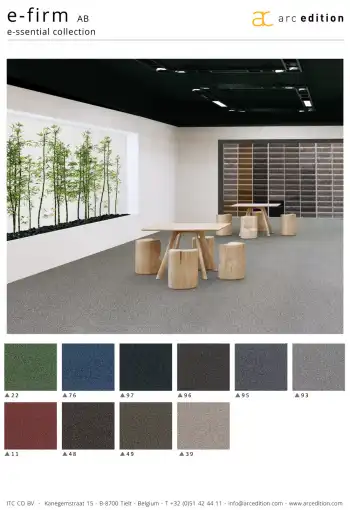 Uzlíkový kancelársky koberec e-firm je vyrobený z polyamidového vlákna s podkladom ActionBack (tkaná syntetická juta), ktoré je pružné a odolné voči mechanickému poškodeniu. Kolekcia e-firm ponúka dvojfarebný krútený slučkový vlas so špičkovou konštrukciou, ktorý je najsilnejší, aký má e-ssential v ponuke. Jeho klasické a prírodné farby poskytujú široký výber na pozdvihnutie podlahových priestorov a ich trvanlivosť v čase.