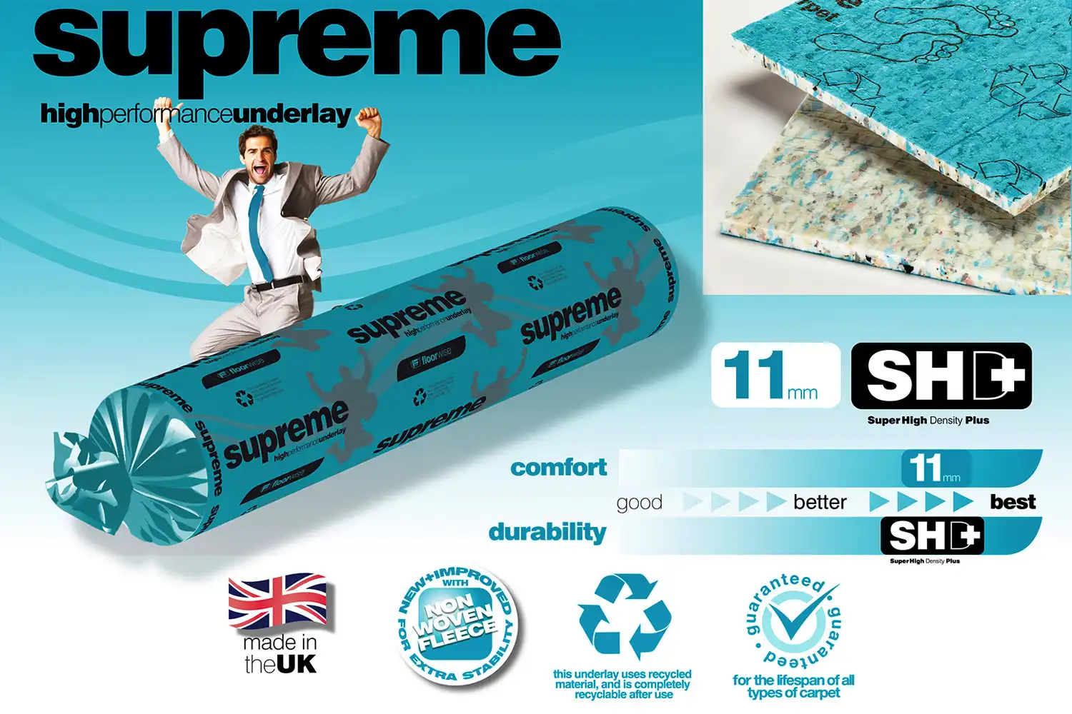 Vysokokvalitná podložka SUPREME je vyrobená z recyklovanej PUR gumy. Použitím tepla a tlaku je tento recyklát zlisovaný dokopy, tým vytvára pružnú, hustú a ľahkú podložku s excelentným komfortom. Vďaka vysokému obsahu gumy a špičkovému prevedeniu je výsledkom veľmi odolná podložka. Tento typ je vhodný do bytových priestorov ako je spálňa, detská izba, obývačka, chodba aj schody.
