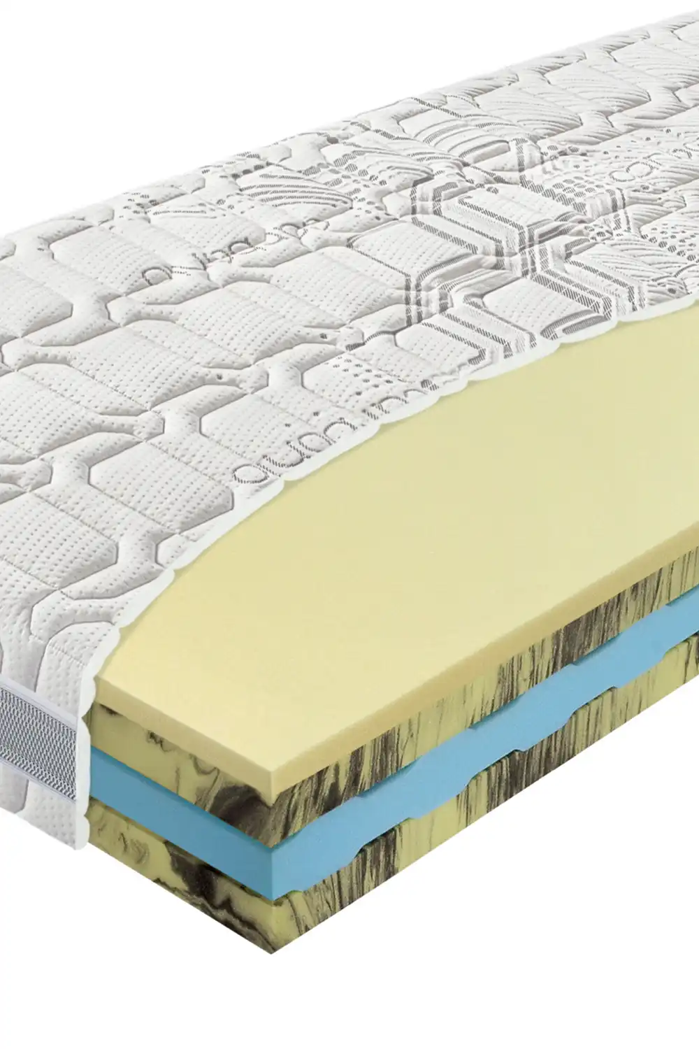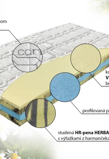 - Vrchný profil: komfortná pamäťová pena VISCO CAMILCA (žltá), platňa studenej HR-peny HERBAL (žlto-čierna)