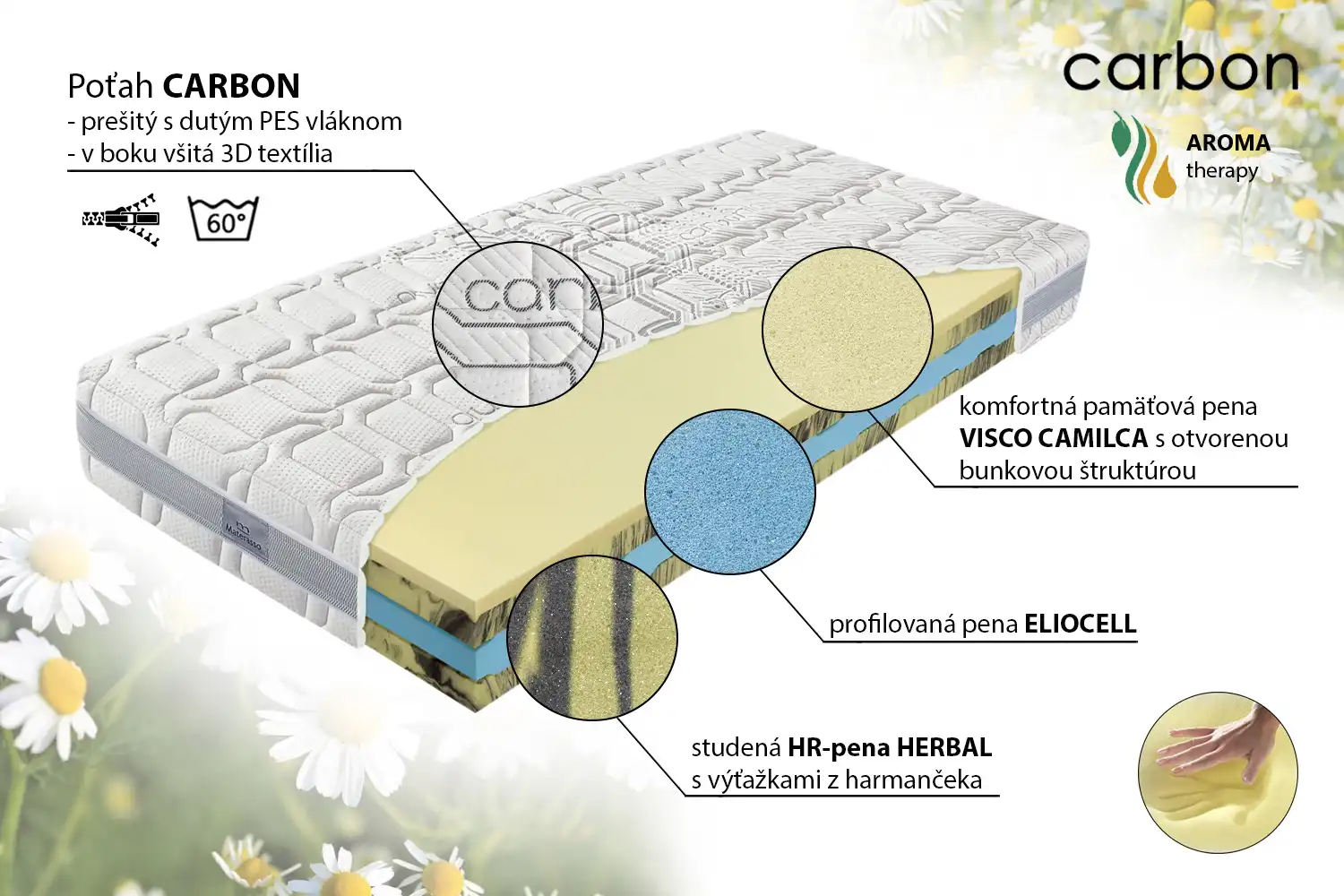 Matrac CAMILCA comfort je viac než len obyčajný matrac – je to prirodzený spánkový rituál, ktorý kombinuje moderné technológie a silu prírody. Špeciálna pena obohatená o harmančekové výťažky pôsobí antibakteriálne, čím pomáha vytvárať čisté a svieže prostredie na spánok. Ergonomická konštrukcia matraca rovnomerne rozkladá tlak tela, čím zmierňuje bolesti chrbta a zlepšuje kvalitu regenerácie počas noci. Vďaka vysokej priedušnosti odvádza vlhkosť a zaisťuje optimálnu cirkuláciu vzduchu, čím predlžuje životnosť matraca a udržiava ho vždy svieži.