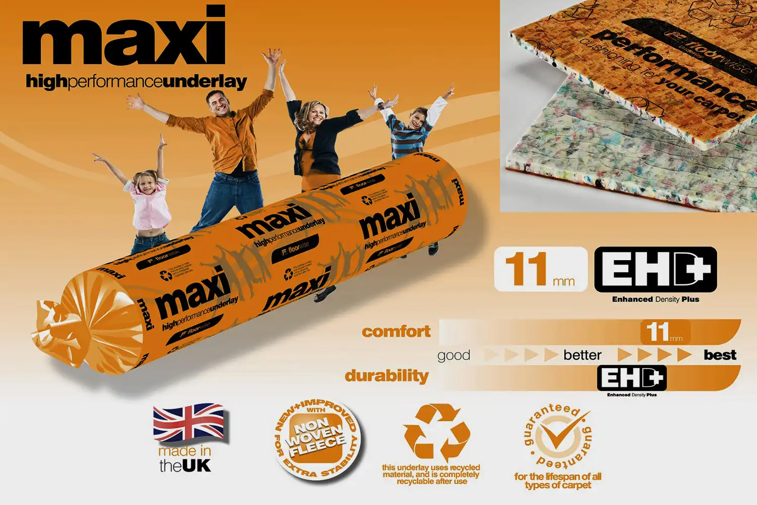Vysokokvalitná podložka MAXI je vyrobená z recyklovanej PUR gumy. Použitím tepla a tlaku je tento recyklát zlisovaný dokopy, tým vytvára pružnú, hustú a ľahkú podložku s excelentným komfortom. Vďaka vysokému obsahu gumy a špičkovému prevedeniu je výsledkom veľmi odolná podložka. Tento typ je vhodný do bytových priestorov ako je spálňa, detská izba, obývačka, pracovňa, chodba aj schody.