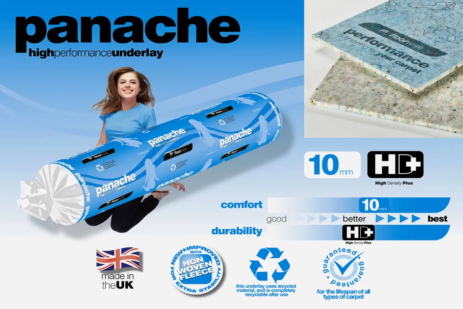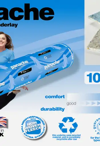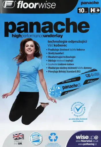 Vysokokvalitná podložka PANACHE je vyrobená zo zmesi izolačných hmôt, ktoré obsahujú vysoký obsah syntetickej gumy. Vďaka výrobnej technológii - formovanie fúkaním - pod vysokou teplotou na vytvorenie bunkovej štruktúry, podložka získava svoje vlastnosti, napr. vhodnosť pre podlahové vykurovanie, komfort a špecifický nášľap. Podložka je vhodná do bytových priestorov.