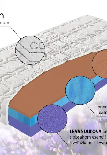 - spodný profil: LEVANDUĽOVÁ pena PUR s obsahom esenciálneho oleja s výťažkami z levandule s hustotou 40 kg/m3 (fialová)