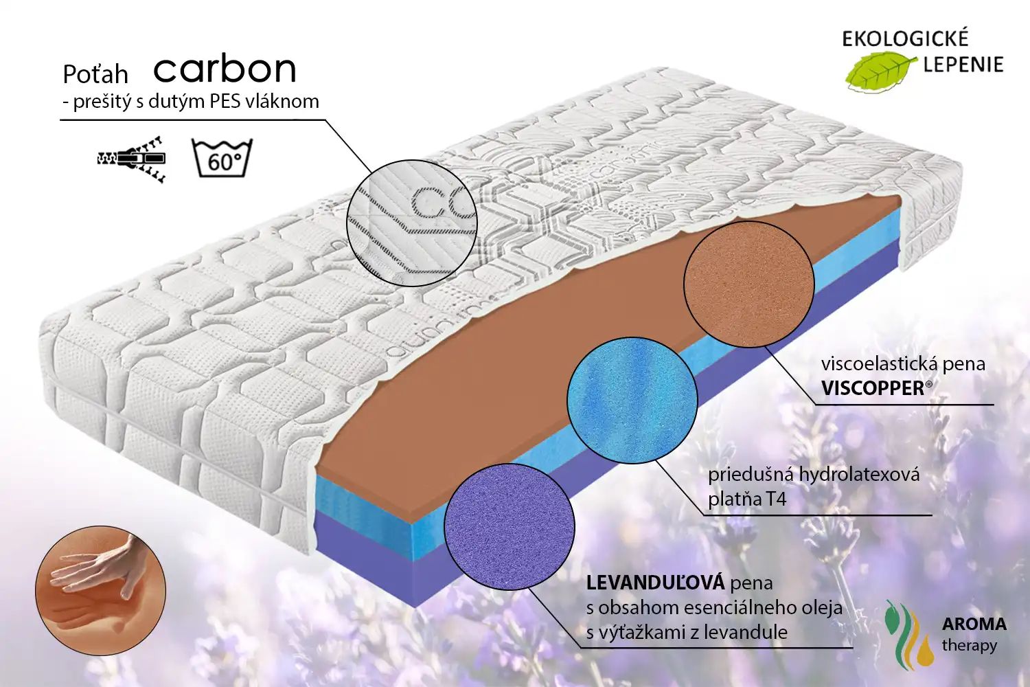 Vrchný profil matraca HYDROLATEX cooper T3 je tvorený novou viscoelastickou penou VISCOPPPER, ktorá výrazne podporuje zdravý spánok. Obsahuje tri prírodné materiály: turmalín, meď a grafit a 50 prírodných stopových prvkov prospešných pre ľudské zdravie. Turmalín posilňuje imunitný systém a vytvára záporné ióny, ktoré zabíjajú plesne, baktérie a vírusy. Meď patrí k najvýznamnejším prvkom v našom tele, je súčasťou viacerých enzýmov. V správnom množstve posilňuje celkovú telesnú imunitu a priaznivo pôsobí na nervovú sústavu. Grafit, forma uhlíka, základného stavebného prvku všetkých živých organizmov. Je žiaruvzdorný s výbornou tepelnou a elektrickou vodivosťou. Tieto materiály blokujú hlavné negatívne vplyvy na ľudské telo, eliminujú rôzne druhy žiarení (signálov mobilných telefónov, wifi, Bluetooth, rádiových vĺn, atď.) a majú aj výrazné antibakteriálne účinky. Poťah CARBON umocňuje vlastnosti peny VISCOPPPER. Uhlíkové vlákno v látke vytvára bariéru proti elektromagnetickému znečisteniu a elektrostatickému výboju, ktoré prenikajú do vnútorných priestorov našich domácností.