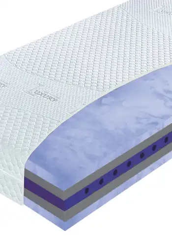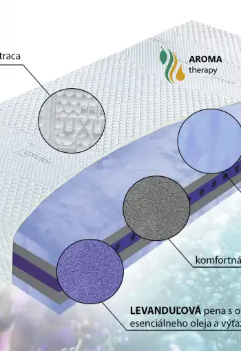 - Jadro matraca: profilovaná LEVANDUĽOVÁ pena PUR so špeciálnym prierezom a s obsahom esenciálneho oleja s výťažkami z levandule s hustotou 40 kg/m3 (fialová)