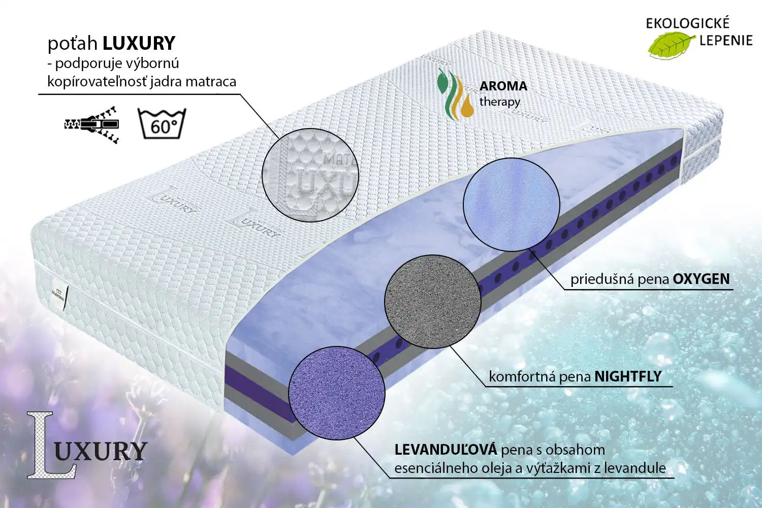 • kombinácia peny Oxygen, Nightfly a Levanduľovej peny – komfort pre dokonalé pohodlie