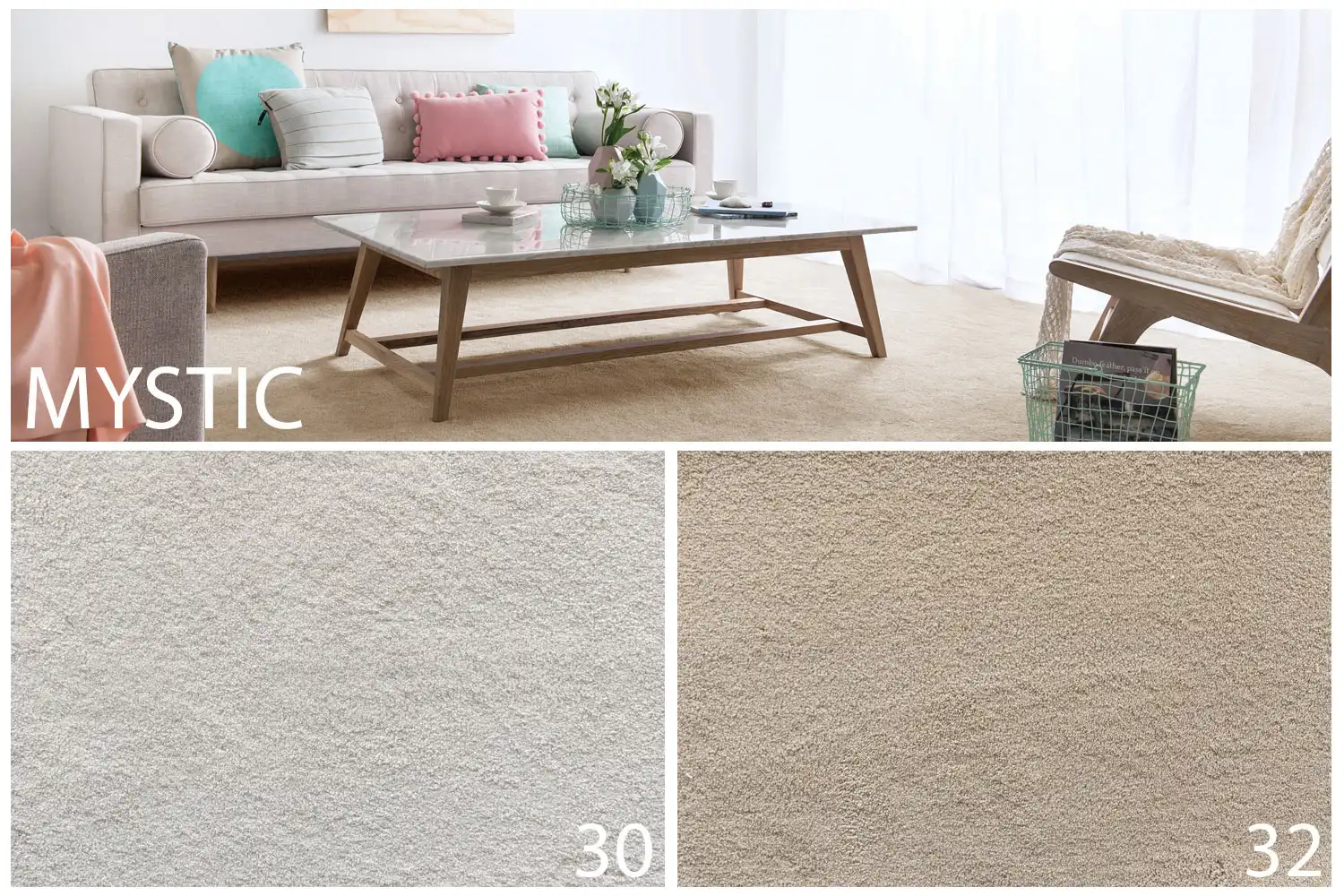 Koberec Mystic je kvalitný polyesterový koberec vyrábaný v dvoch farebných odtieňoch, ktoré vytvárajú tichú a pokojnú atmosféru v spálni alebo v obývačke. Polyesterové vlákna sú mäkké, ľahké a mimoriadne jemné. Koberec má tmavý filcový podklad Ecolux, ktorý zvyšuje mäkkosť koberca na došľap, zlepšuje izolačné vlastnosti či už ide o zvuk alebo teplo a predlžuje životnosť vlákna. Koberce z kolekcie Mystic sú odolné voči slnečnému žiareniu, tlmia kročajový hluk, majú protišmykovú úpravu, sú vhodné na podlahové vykurovanie a na schodiská v domoch či v bytoch. Tieto koberce Vám prinesú očarujúco mystické potešenie pri každom kroku.