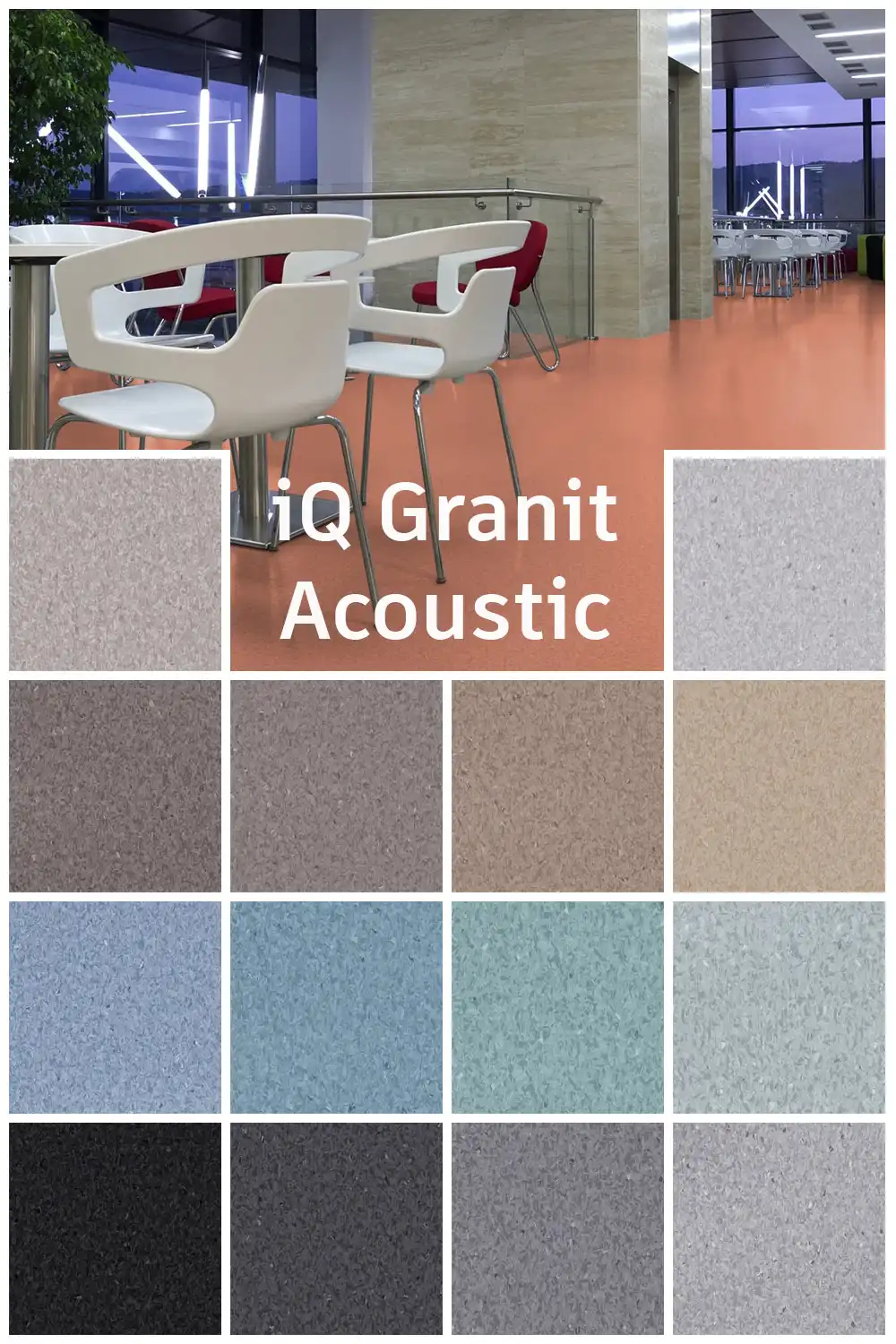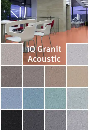 Vinylová podlaha iQ Granit Acoustic kombinuje vysokú funkčnosť s vynikajúcim pochôdzným komfortom a kročajovým útlmom 15 dB. Je navrhnutá pre priestory s intenzívnou prevádzkou, kde je dôležitá akustická pohoda, ako napríklad nemocničné chodby a izby. Vyznačuje sa mimoriadnou trvanlivosťou a odolnosťou voči opotrebovaniu, škvrnám a oderu, čím zabezpečuje dlhodobú estetiku aj v priestoroch s vysokou prevádzkovou záťažou. Na údržbu nevyžaduje použitie leštidiel ani voskov – pôvodný vzhľad je možné jednoducho obnoviť suchým preleštením. PVC podlaha iQ Granit Acoustic je navrhnutá tak, aby bez problémov odolávala zaťaženiu kolieskových stoličiek a bola kompatibilná s podlahovým vykurovaním.