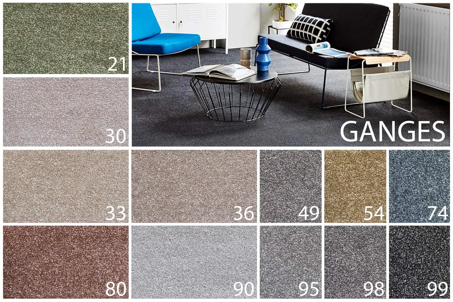 Koberec Ganges (Ganga) je polyesterový velúrový koberec v rôznych zaujímavých farbách s decentným melírom. Vyrába sa na kvalitnom ECO FusionBac podklade vyrobenom zo 100% recyklovaných PET fliaš. Filcový podklad zvyšuje pohodlie pri chôdzi, predlžuje životnosť koberca, zvyšuje tepelnoizolačné vlastnosti. Farby a typ koberca pôsobia elegantne čím zútulnia každý interiér. Vďaka výške vlákna a filcovému podkladu je koberec mäkký, príjemný na došľap a tlmí kročajový hluk. Svoje dokonalé miesto má predovšetkým v izbách akými sú spálňa, obývačka, hosťovská izba a aj jedáleň.