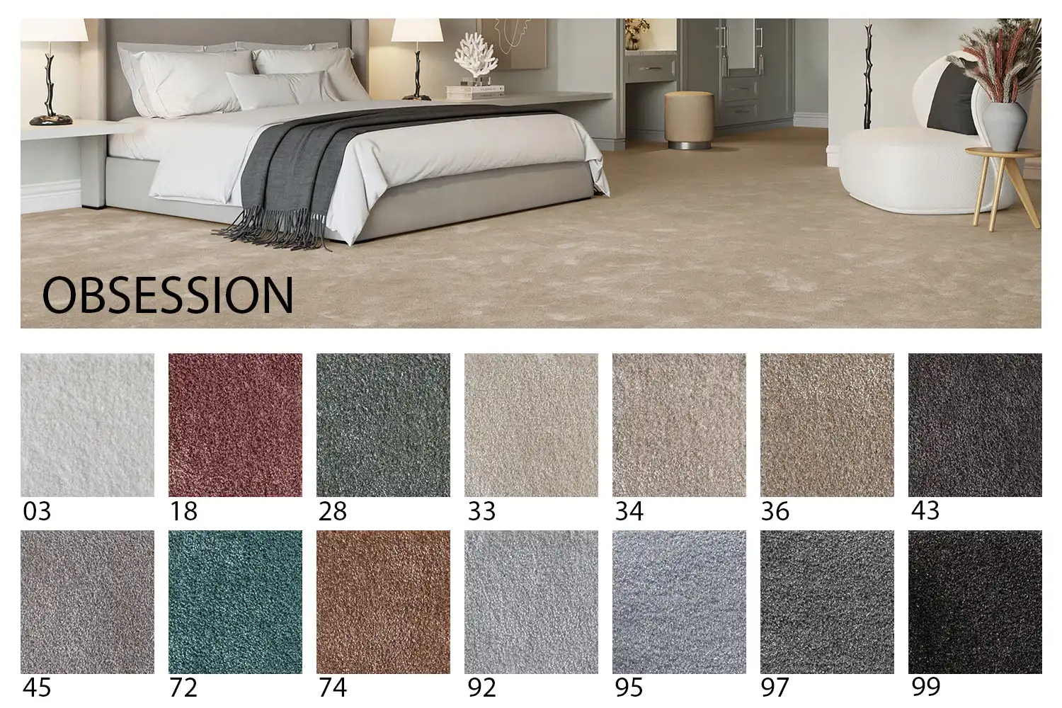 Koberec z luxusnej kolekcie Obsession (Posadnutosť) vyvolá vo Vás vyššiu úroveň zmyselnosti a prebudí novú dimenziu jemnosti. Je vyrábaný z kvalitných polyamidových vlákien s podkladom FusionBac, ktorý zvyšuje tepelnoizolačné vlastnosti, pevnosť, odolnosť, luxusnosť a predlžuje životnosť vlákna. Koberec Vám ponúkame v rôznych farebných odtieňoch s dlhším lesklým strihaným a hebkým vlasom. Prežite svoju POSADNUTOSŤ v diskrétnych a jemných tónoch v spálni, v obývačke alebo doprajte jeho mäkkosť a jemnosť svojej návšteve v hosťovskej izbe.