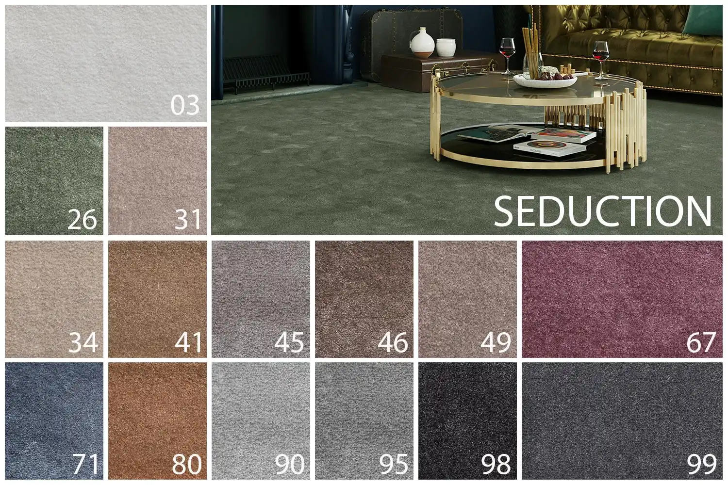 Koberec z luxusnej kolekcie Séduction (Zvádzanie) očarí hodvábnymi odtieňmi a fascinujúcou textúrou. Zvedie Vás svojou mäkkosťou, neodolateľnou jemnosťou a pevnosťou zároveň. Jednoducho pohodlie a krása. Koberec Séduction je vyrábaný zo 100% polyamidovej priadze, ktorá zaisťuje jedinečnú mäkkosť, povrchovú úpravu a odolnosť voči ušliapaniu a opotrebovaniu. Podklad FusionBac zvyšuje tepelnoizolačné vlastnosti, pevnosť, odolnosť, luxusnosť a predlžuje životnosť vlákna. Doprajte Zvádzanie Vašim chodidlám v spálni, v obývačke, v hosťovskej izbe alebo, vďaka svojej triede zaťaženia, očarí aj v kancelárii a v hotelovej izbe.
